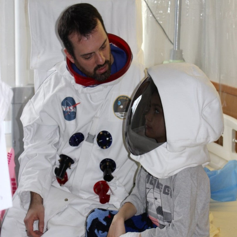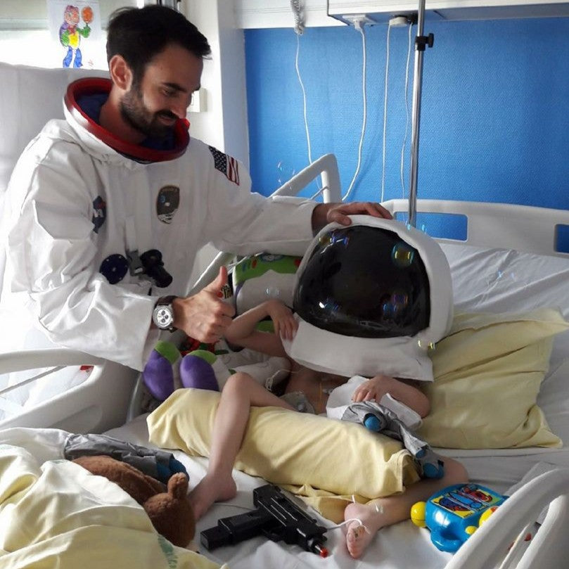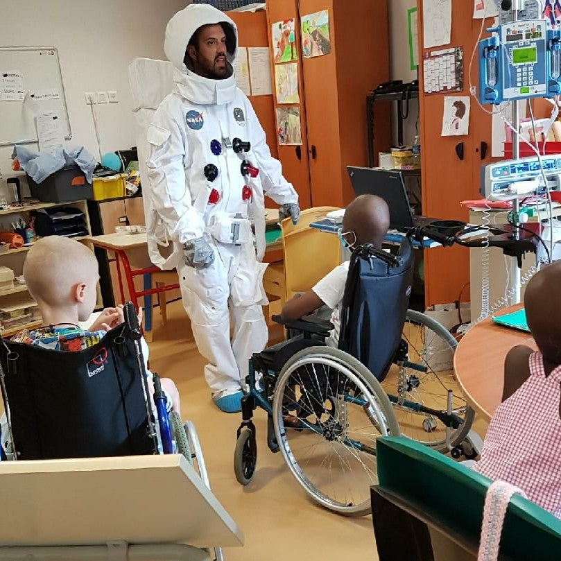 Is it possible to smile from ear to ear and cry at the same timeBecause I did just that when I saw these photos sent to me by Sylvain Bouley, president of Les p'tits cueilleurs d'étoiles association in France. Members of this organization visit hospitals to speak to children about astronomy while wearing one of our space suits. There are good people doing good things in this world!! Thank you and your team Sylvain.